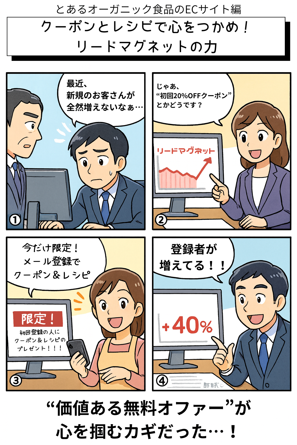 成功事例:あるオーガニック食品のECサイトは、メールマガジン登録者限定で「初回購入20%OFFクーポン」と「旬の野菜を使った簡単レシピ集」を提供したところ、新規顧客の獲得率が前年比で40%向上し、リピート購入にも繋がりました。