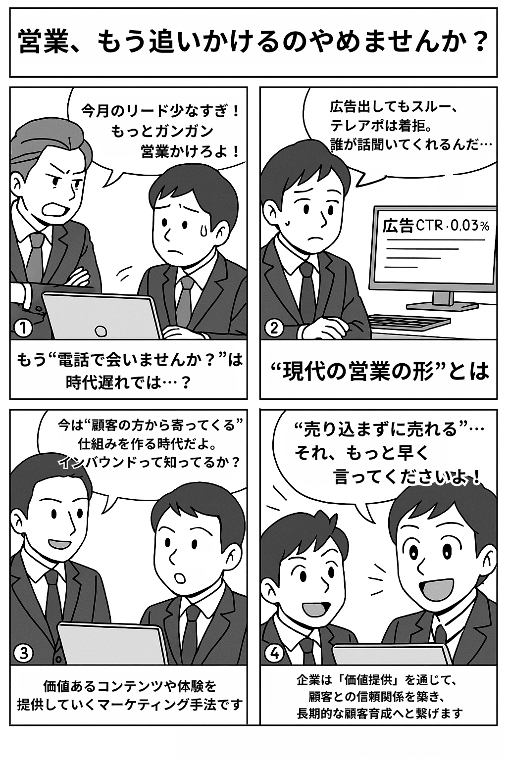 広告主導型のアプローチとは異なり、顧客の課題やニーズに寄り添い、解決策を提示することで、自然な形で関係性を構築していくことを目指します。