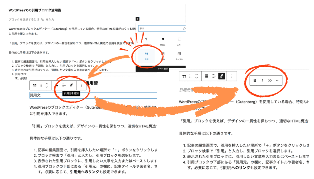 WordPressのブロックエディター(Gutenberg)を使用している場合、特別なHTML知識がなくても簡単に引用を挿入できます。