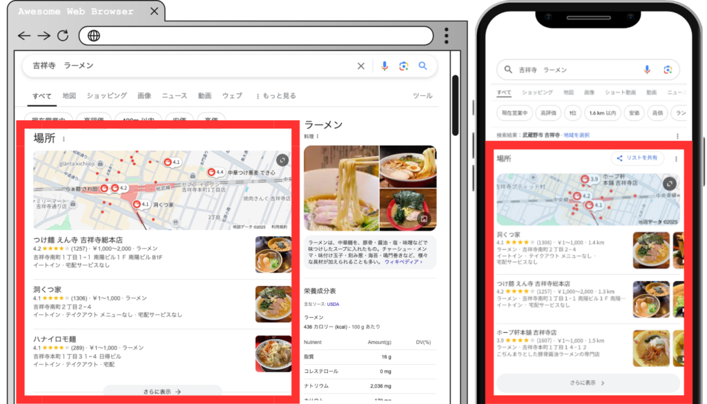 - 特徴 写真、店舗名、評価(星の数)、口コミ数などがリッチに表示されます。