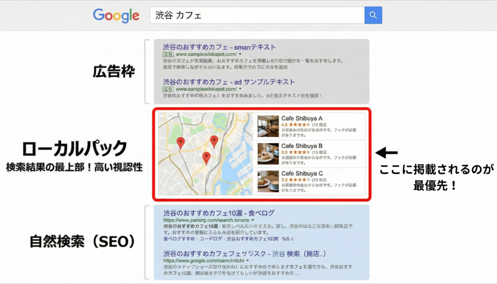 ローカルパックは、実店舗を持つビジネスにとって「現代の看板」とも言える最重要エリアです。