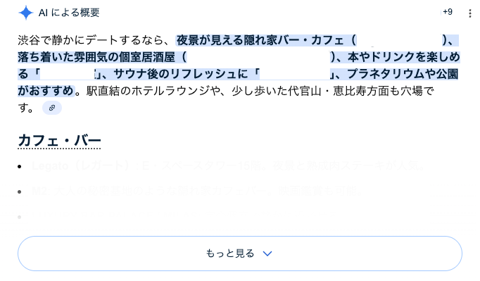 例えば、「渋谷 デート 静か」と検索された際、AIは口コミの中に「店内が静かで落ち着ける」「カップルシートがある」といった記述がある店舗を優先的にピックアップして要約文の中で紹介します。