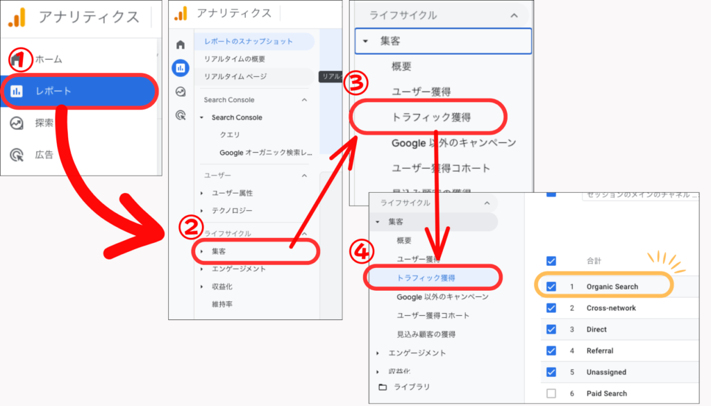 施策はやりっぱなしではいけません。Googleアナリティクスなどのツールを使い、どのページがオーガニック検索(Organic Search)から流入を得ているかを確認しましょう。