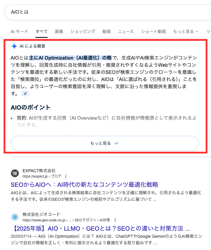 Googleが導入したAI Overviews(AIO)は、ユーザーの質問に対してAIがWeb上の情報を要約して回答してくれる機能です。