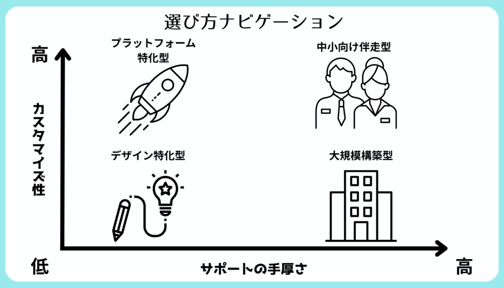 ここでは、お客様の事業規模や目的、重視する点に応じて、どのような制作会社を選ぶべきか、タイプ別に詳しくご紹介します。